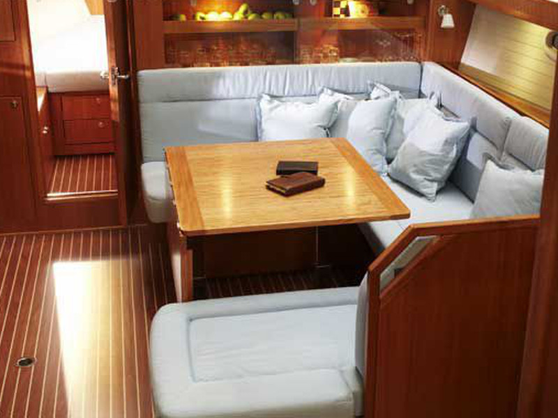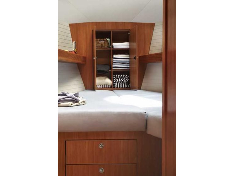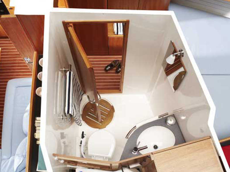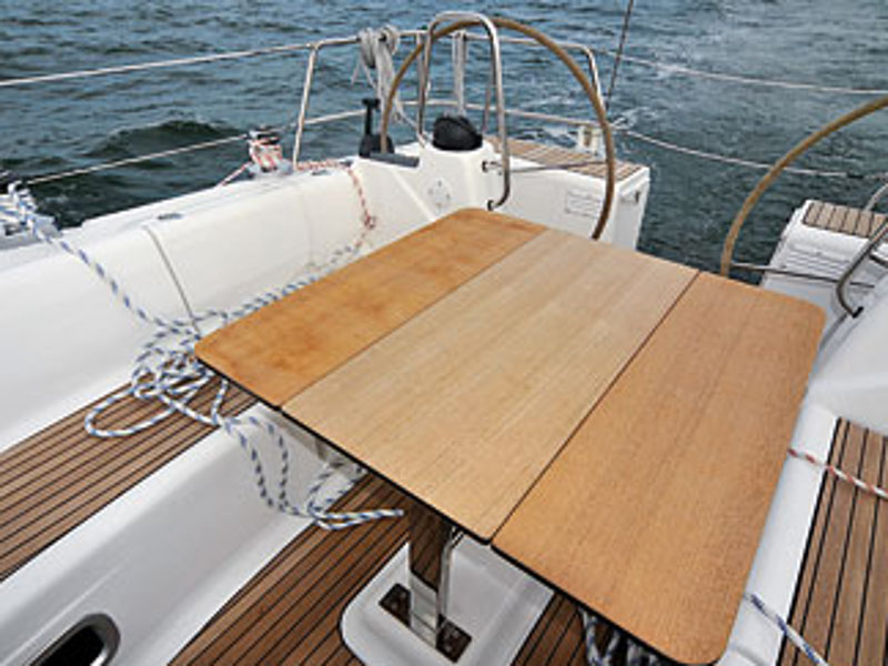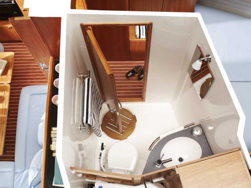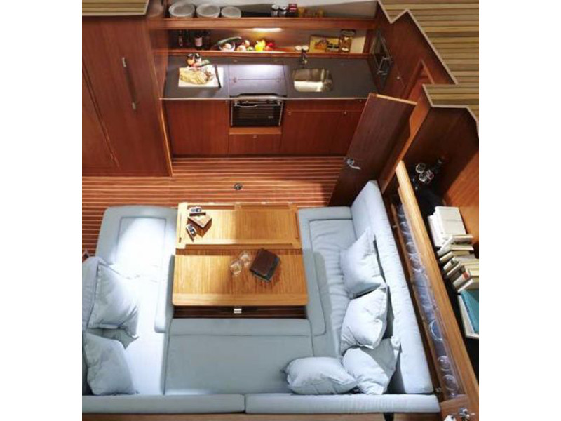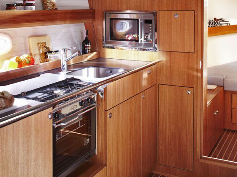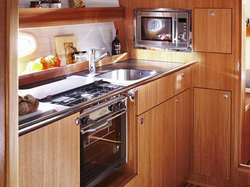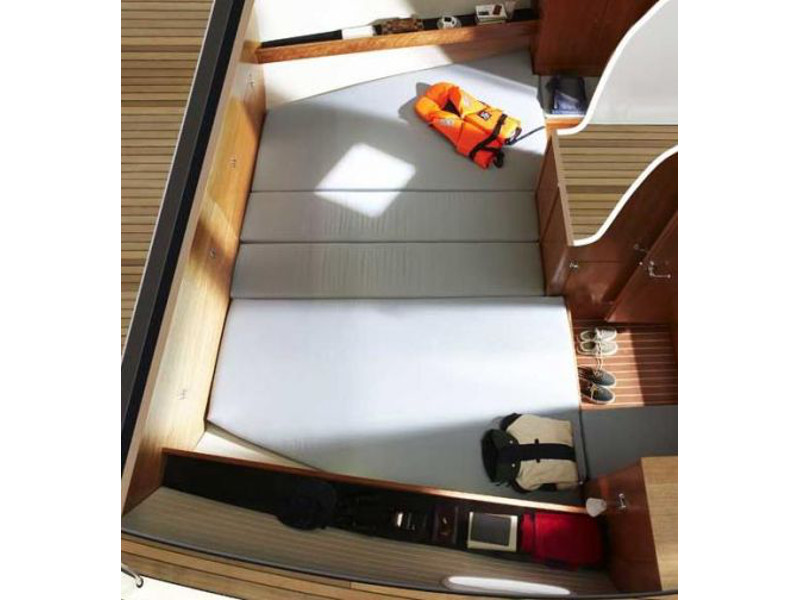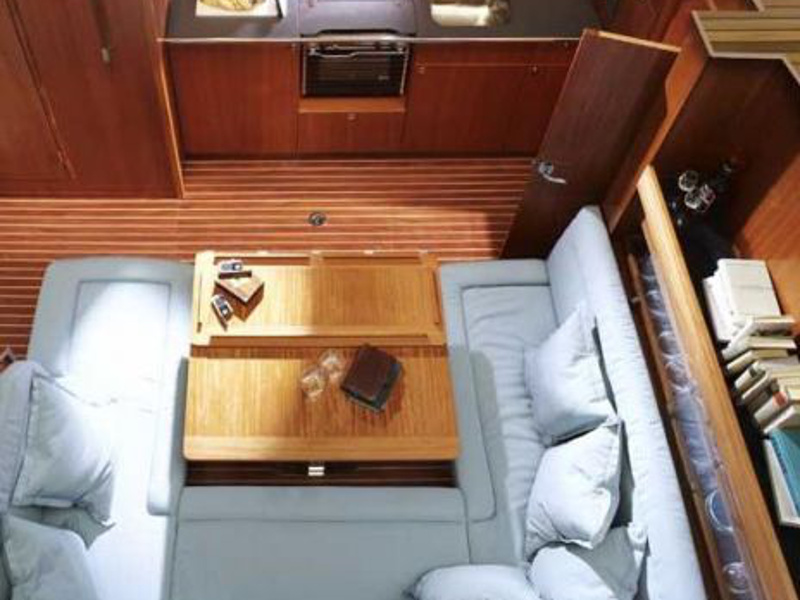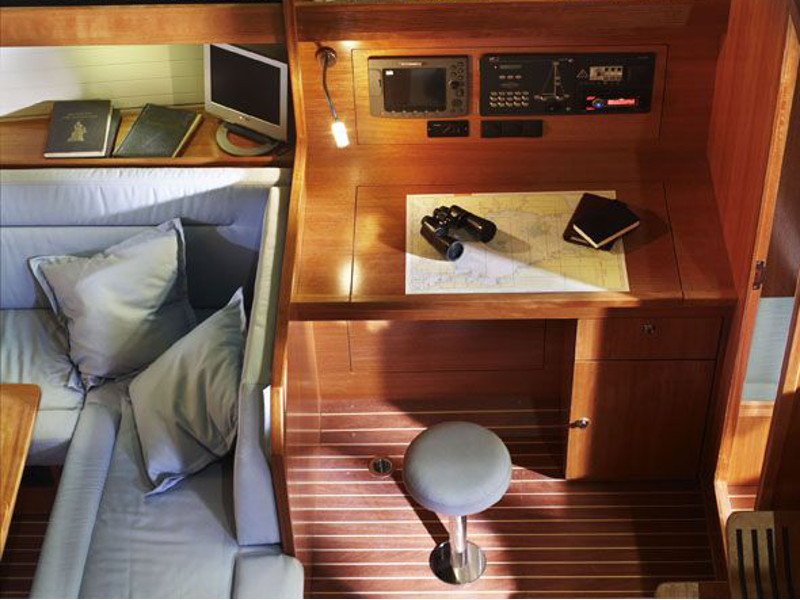 Autopilot, Barometer, Bimini top, Binoculars, Chart plotter in cockpit, Cockpit shower, Electric aluminum gangway, Electrical windlass, Electric toilet, Extra jerry cans, Fire extinguisher, First aid kit, Flares, Fog horn, Holding tank, Life jackets, Life raft, Maps, Microwave, Mooring ropes, Navigation equipment, Pilot books, Radar reflector, Radio-CD player, Refrigerator, Shore power, Solar panel, Sprayhood, Tools, Warm water, Wind instruments