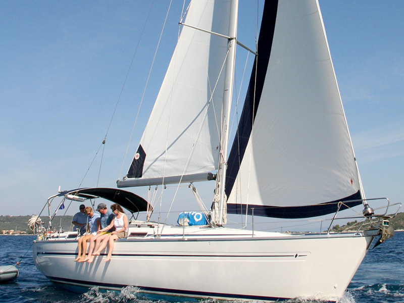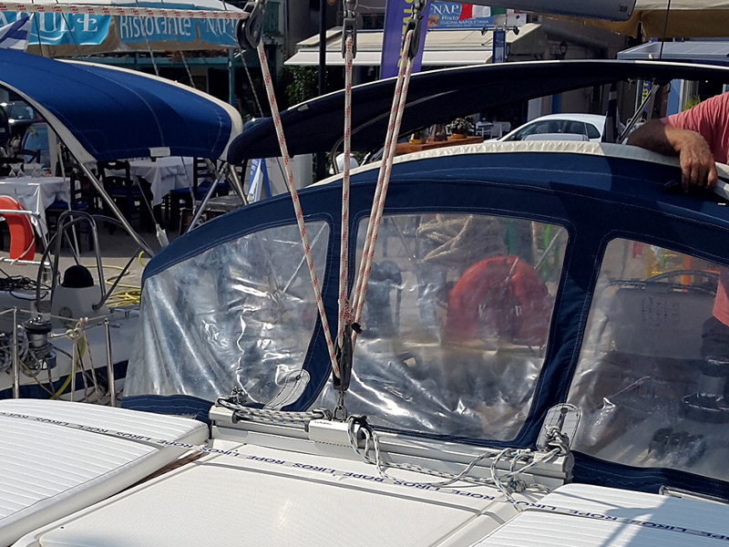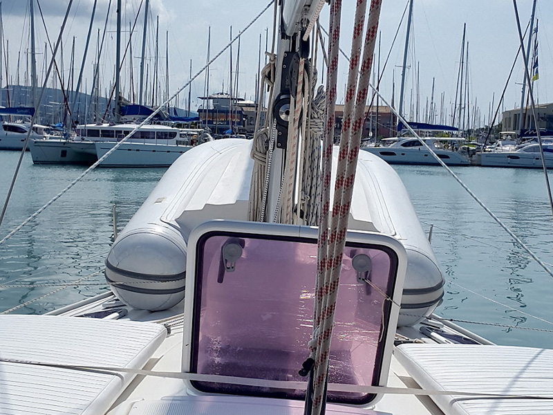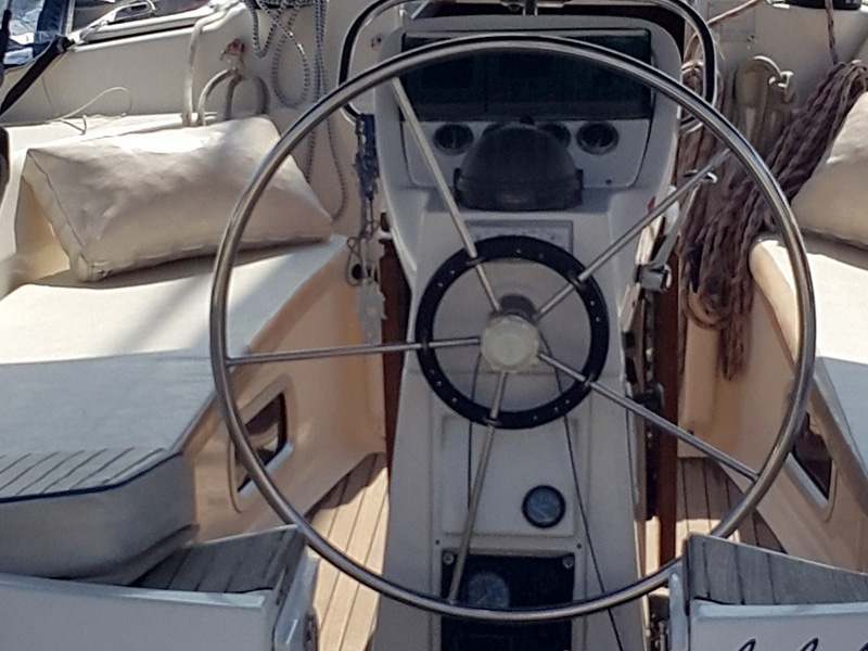 Custom made mattresses for sunbath in bow, Cushions in the cockpit, Autopilot, passerelle, Bathing platform, Bimini, Dinghy, Fresh water deck shower, Outboard engine, Solar panels, Sprayhood, Satellite navigation systems, VHF radio, CD player, Furling main sail, Roller reefing Genoa