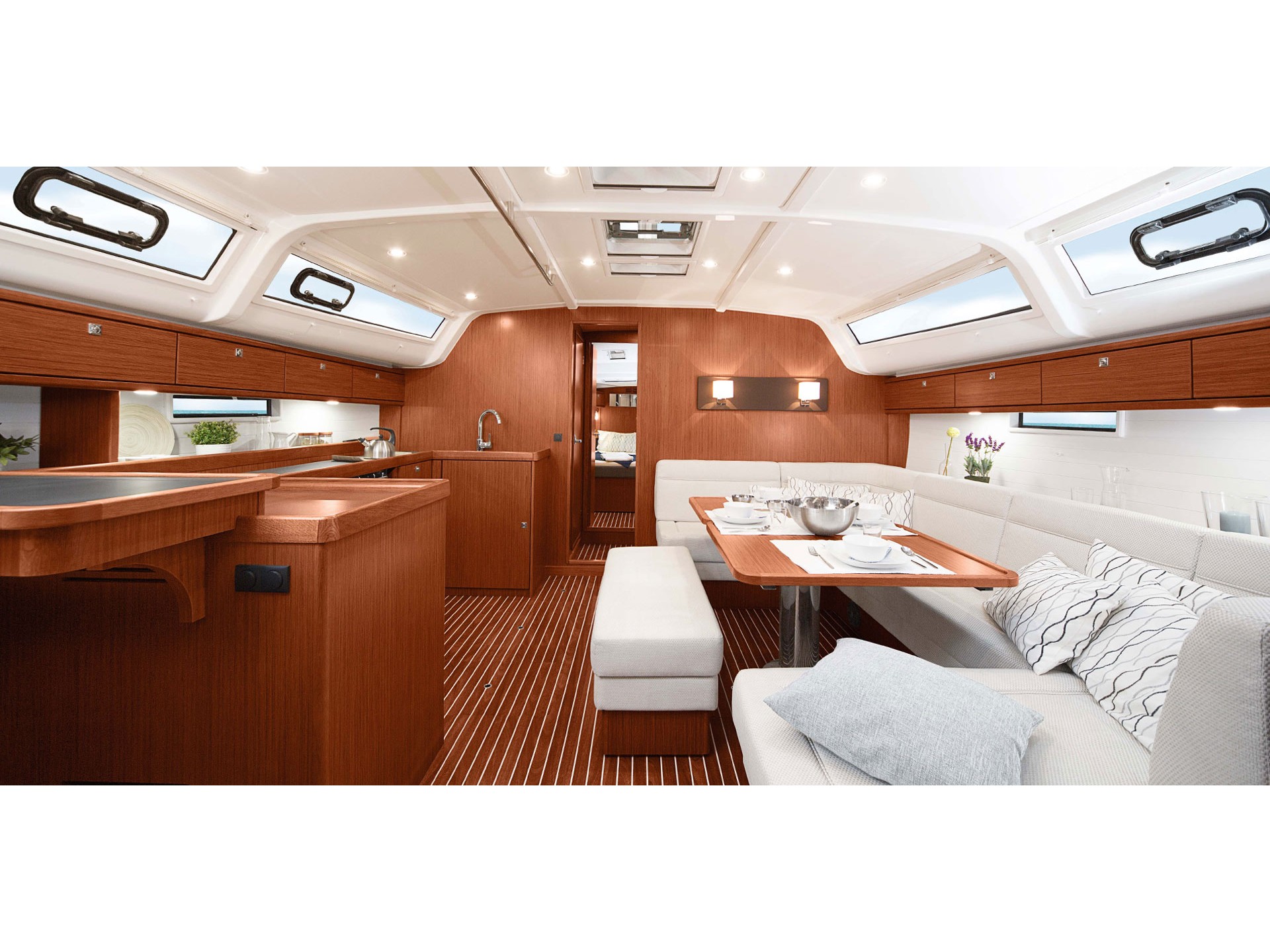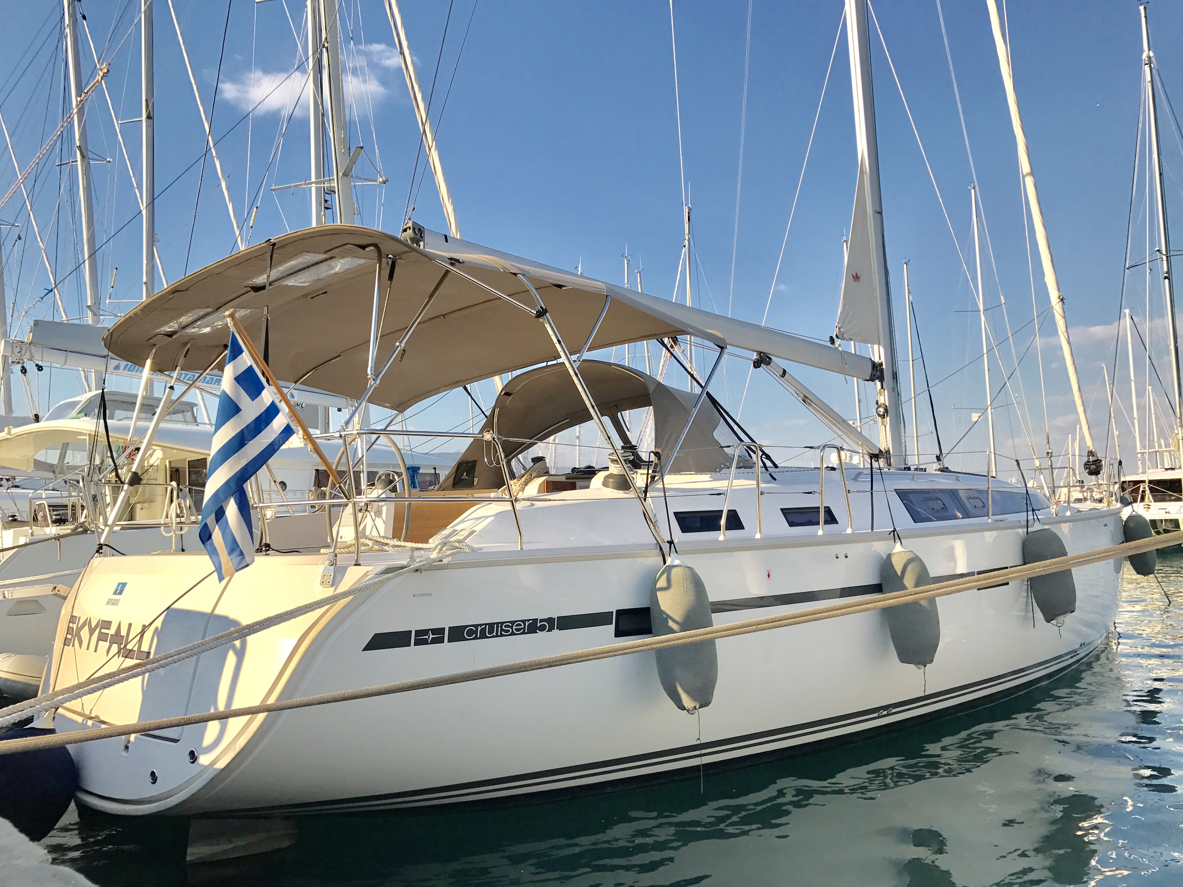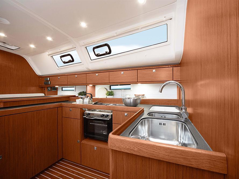 Dinghy, Bed linen, Showering towels, Bimini top, Bow thruster, Double steering wheel, Spray hood, Autopilot, Chart plotter, GPS, VHF Radio, Furling (Roll) main sail, 2 tablet devices, Inverter 12/220 V, Unlimited free WiFi, Automatic shower drains, Sunbeds at Bow, Gangway, Inverters 3000 VA - 300 VA, Solar panels, Teak in cockpit and bathing platform, Additional water tank 150 L