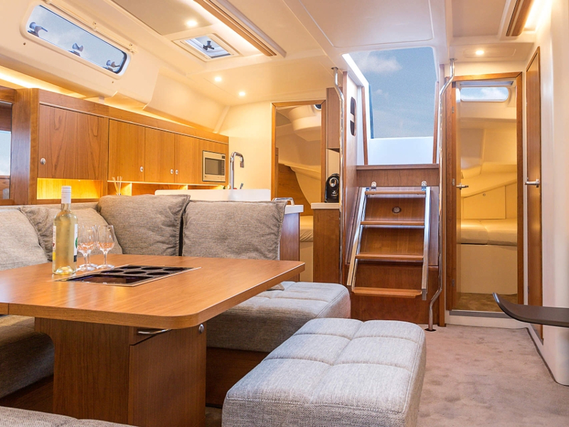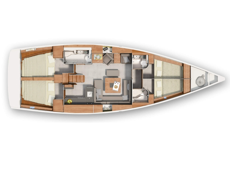 Bow thruster, Self tacking jib, Bimini, Sprayhood, Inverter, Autopilot, Bow thruster, GPS chart plotter-cockpit, GPS chart plotter inside, Navigation (Nautical) charts and nautical guide, Tridata, Pilot book, Battery charger, VHF radio, Bathing platform, Cockpit/stern, outside shower, Sprayhood, Teak cockpit, Gas cookers (stove), Kitchen utensils (Galley equipment, cutlery), Oven, Refrigerator, Hot water, Bed linen, Outside speakers, Fusion radio set, Dinghy, Extra LEWMAR 45 ST EVO manual halyard winches