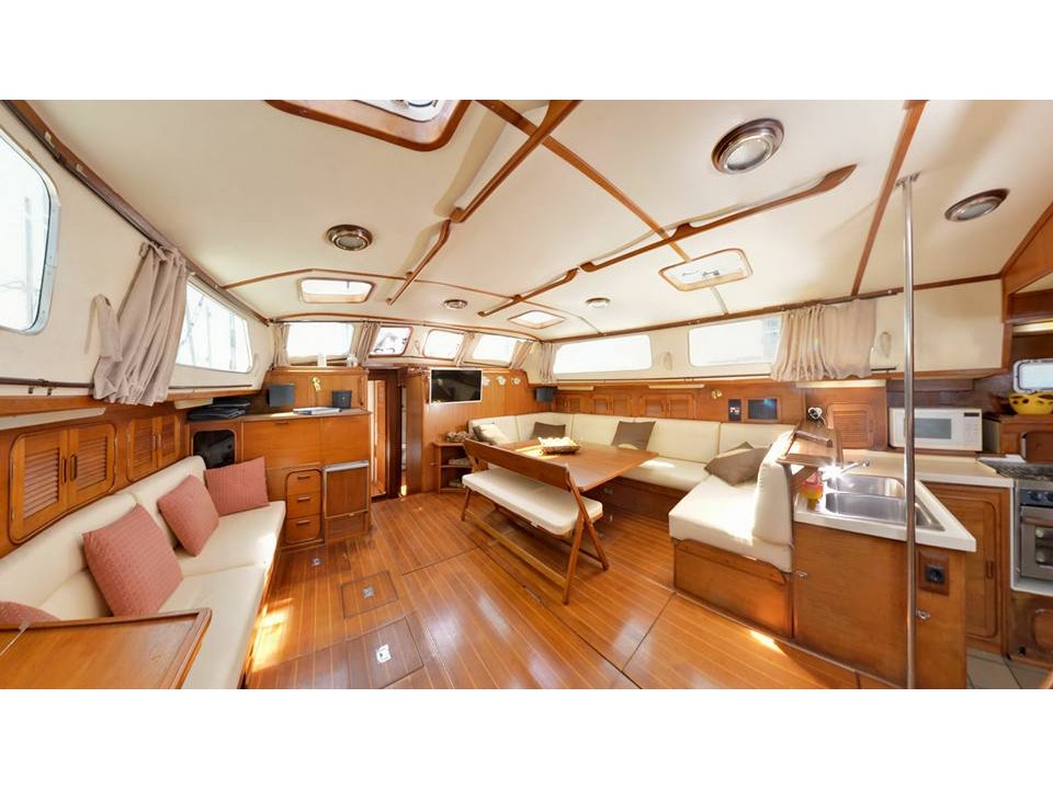 Anchor with chain & rope, Awning, Bimini top, Cockpit cushions, Electric winch, Fenders, Gennaker, Manual winch, Mooring ropes, Pulleys, Spinnaker, Sprayhood, Steering wheel, Winche handle, Air conditioning, Automatic light, Autopilot, Electric converter, Extinguisher, Full batten main sail, Furling genoa, Generator, GPS plotter chart table, GPS plotter cockpit, Horseshoe buoy, Hot water, Mobile GPS plotter, Safety harness, Solar panels, Water maker, Bosuns chair, Child harness, Dinghy, Electric windlass, Foghorn, Lazy bag, Life lines, Life raft, Outboard engine, SUP, Swiming ladder