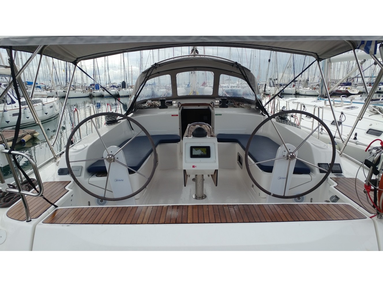 Bow thruster, GPS + Plotter on deck, Solar Panel, Bimini, Spray Hood, Auto Pilot, Battery charger+wire, Bed linen-towels, Echo-shounder, Electric windlass, Flippers and mask, Hot Water, Log, Outboard, Swimming ladder, Bathing plattform, Radio mp3 player, Furling Main Sail, Furling Jenoa