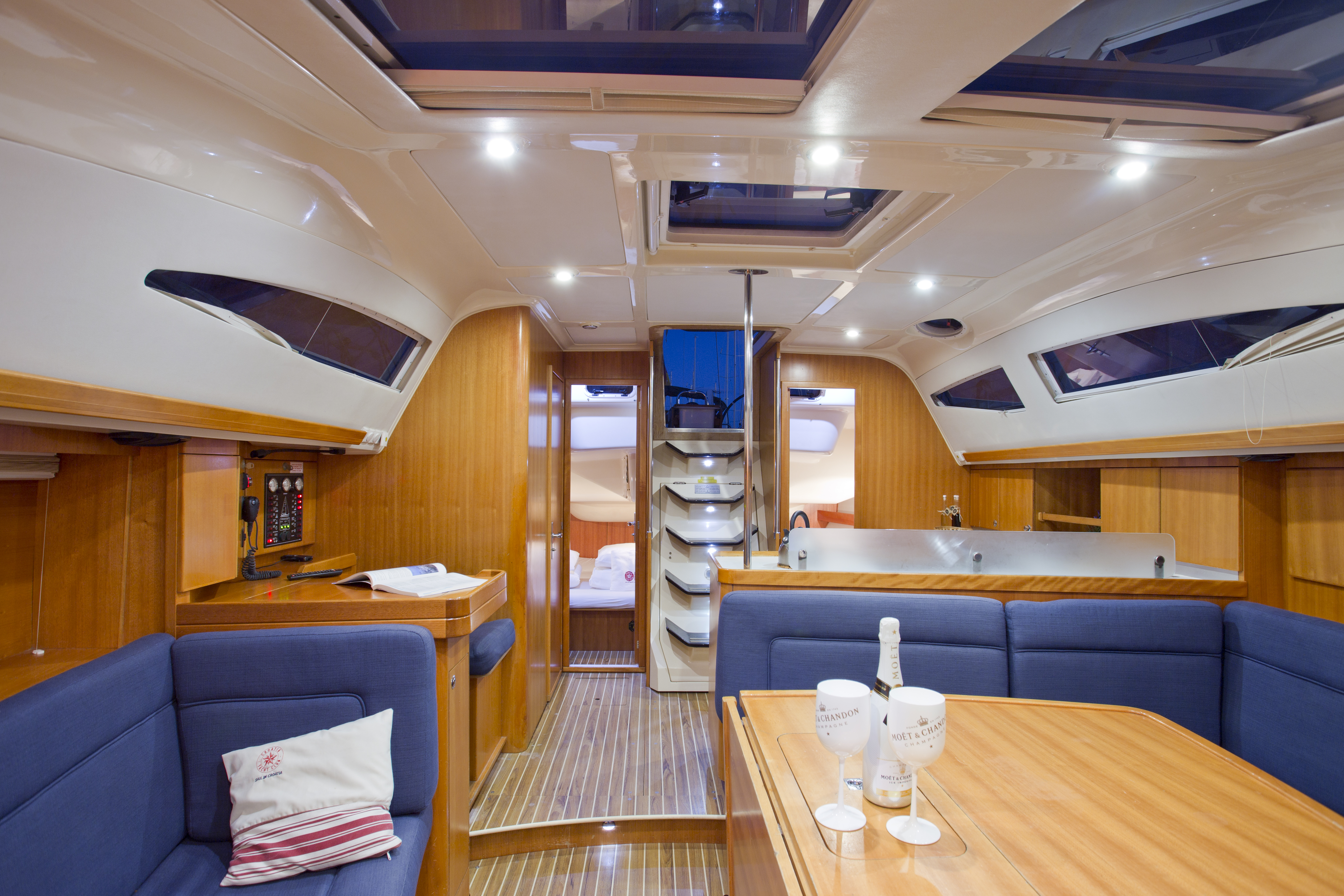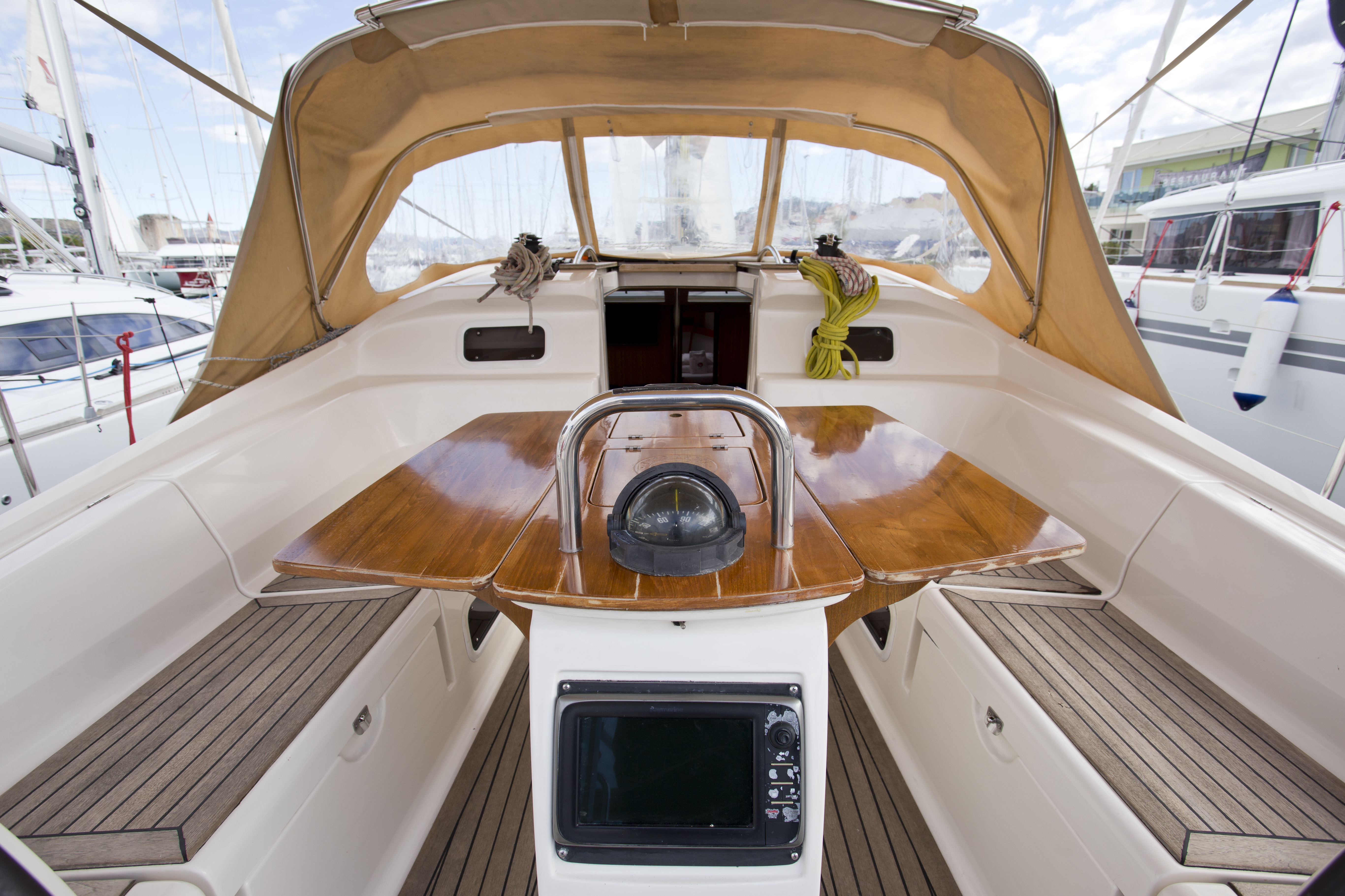 GPS plotter in cockpit, Autopilot, Bimini, Bowthruster, Cockpit table, Deck shower, Depth sounder, Dinghy, El. charger, Electric anchor winch, Electric bilge pump, Electric fridge, Furling Genoa, Hot water, Manual bilge pump, Nautical charts, Nautical guide, Self tackling winch, Stereo/CD, VHF, Bed sheets and towles, Kitchen equipment, Life jackets, Navigation equipment, Safety harnesses, Shore power, Heating, Sprayhood, Standard mainsail, 2 steering wheels, Folding propeler, Freezer , Holding tanks, New sails 2017, Pets are not allowed onboard
