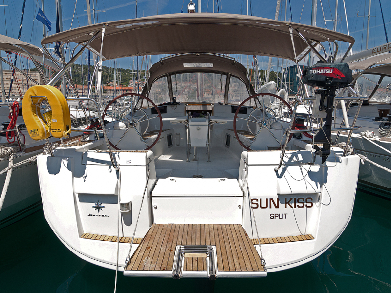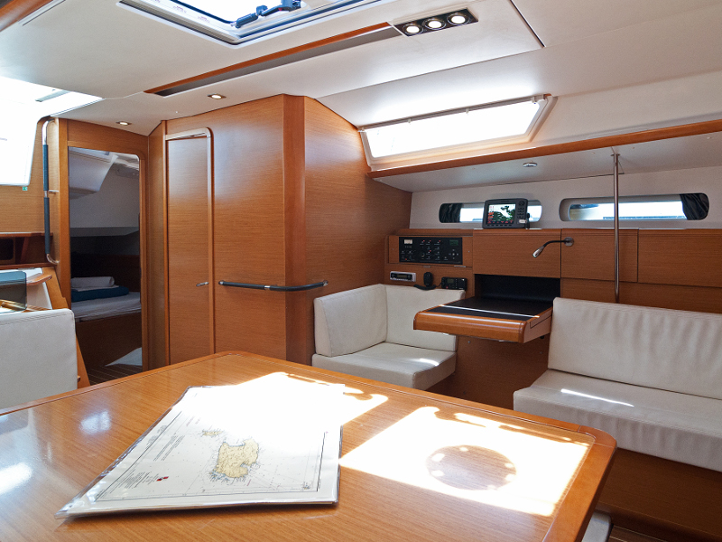 Bimini top, Cockpit shower, Cockpit table, Dinghy, Electric anchor windlass, Emergency tiller, Fenders, Furling genoa, Furling main sail, Main anchor + 50 m chain, Mooring ropes, Second anchor + rope, Autopilot, Depth instrument, Divider + plotter, GPS, Hand bearing compass, Harbour guides, Log/Speed instrument, Main compass, Navigation charts, VHF radio, Windex, Fire extinguisher, First aid kit, Horse shue buoy + light, Life belts, Life jackets, Rockets and Torches, Torch light, Wire cutter, Sprayhood, Bow thruster, Bedding, Towels