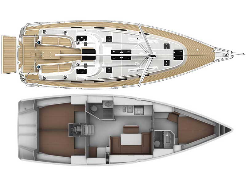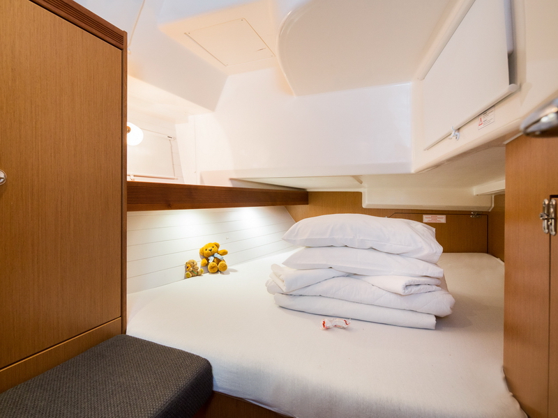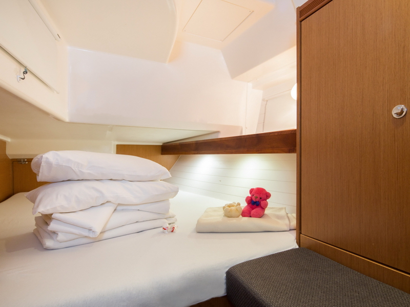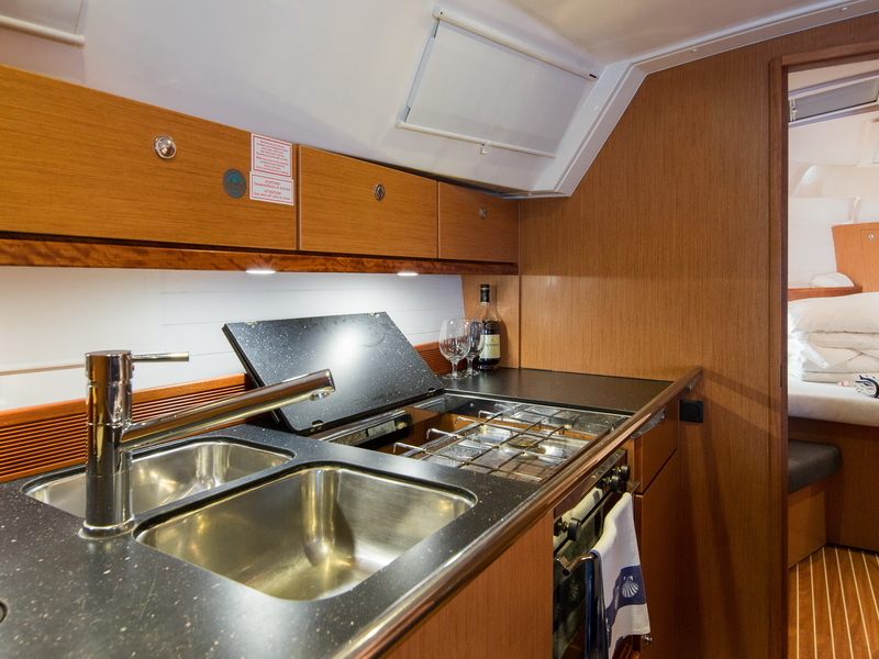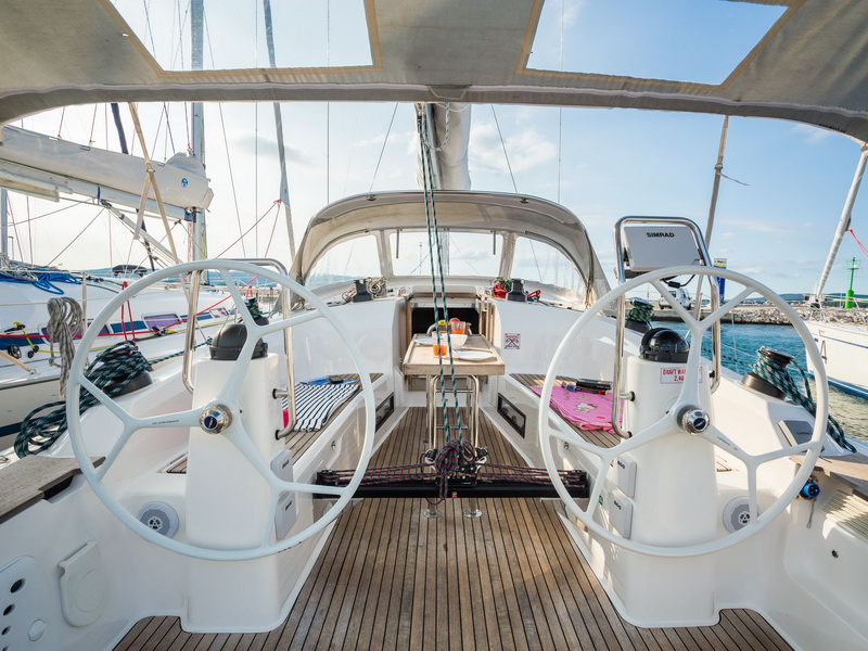 Box of flares, Emergency tiller, First aid kit, Floating light, GMDSS, Horse shoe buoy, Life jackets, Safety harnesses, Smoke box, Torch, Autopilot, Chart plotter in cockpit, Compass, Eletronic sea charts, GPS, VHF radio, Wind speed meter, Furling genoa, Lazy jack, Mail sail full batten, Spinnaker pole, Winches GENOA SHEET X2, Winches HALYARDS X2, Winches MAIN SHEET X2, Anchor electric windlass, Battery charger + shore cable, Bed linen, Bimini top, Cockpit speakers, Cockpit table, Deck shower (hot water), Dinghy, Electric bilge pump, Electric fridge, Free unlimited internet, Gangway, Gas bottle, Gas stove with oven, Heating, Hot water, Radio / CD player / MP3 /USB, Sprayhood, Steering wheel, TV / DVD