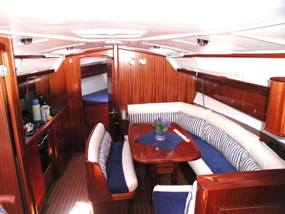 220V shore supply & battery charger, Autopilot, Bathing platform and deck shower, Bimini top, CD player, Chart plotter, Cockpit cushions, Cockpit speakers, Electric fridge, Electric windlass, Furling genoa, Furling main sail, GPS, Holding tank, Warm water, Wind instruments, Steering wheel, Aluminium gangway, Microwave oven, Electric WC pumps