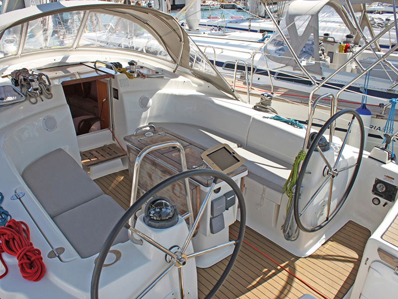 220V Battery charger, Apple iPAD, Auto helm autopilot, Auto helm depth system, Auto helm speed system, Auto helm wind speed/direction, Automatic life vests, Bed linen, Bimini, CD player with USB, MP3 and Bluetooth, Cockpit cushions, Cockpit LED lights, Cockpit speakers, Cockpit table, Deck shower, Dinghy, Electric anchor windlass, Full kitchen inventory, Furling Genoa, Furling mainsail, GPS plotter, Hot water, Inverter 12V-220V, Refrigerator, Self tail winches, Solar panels, Sprayhood, Steering wheel, Transom swimming ladder, VHF Radio, Windex