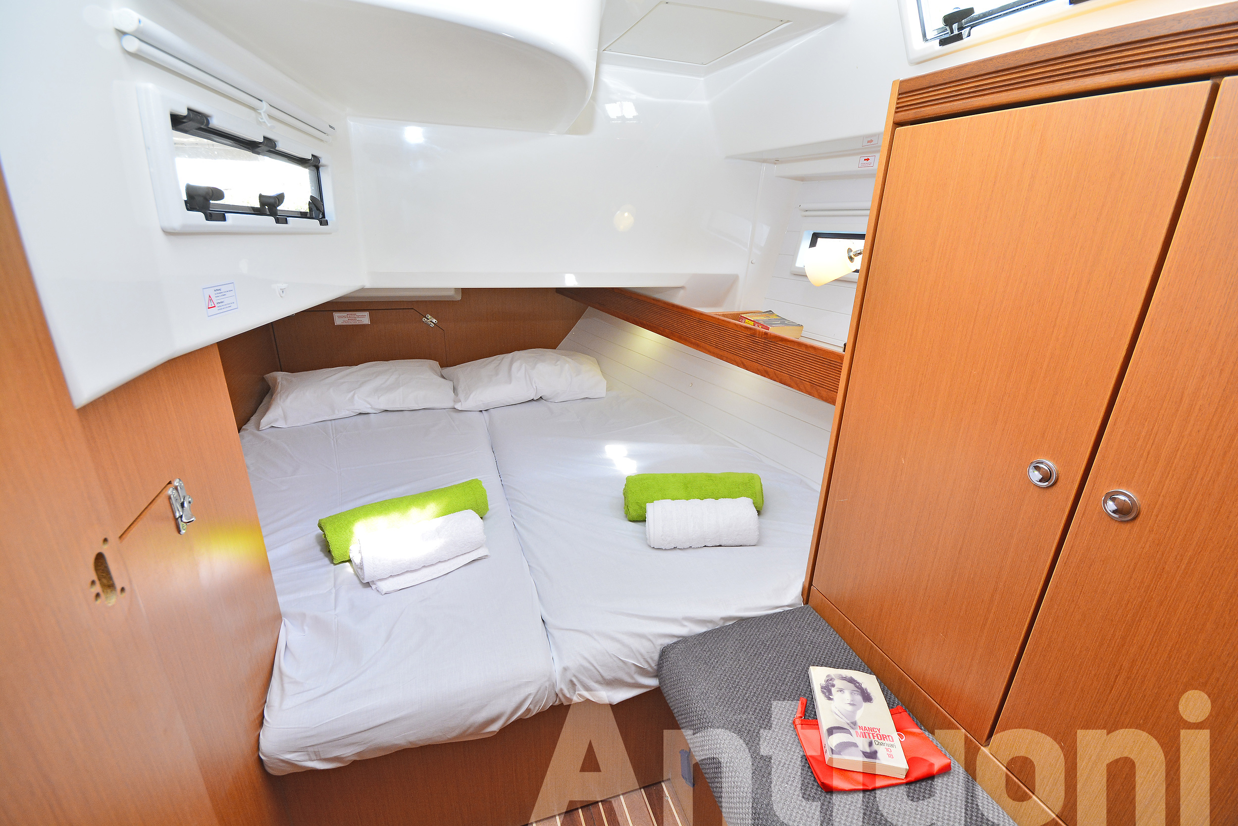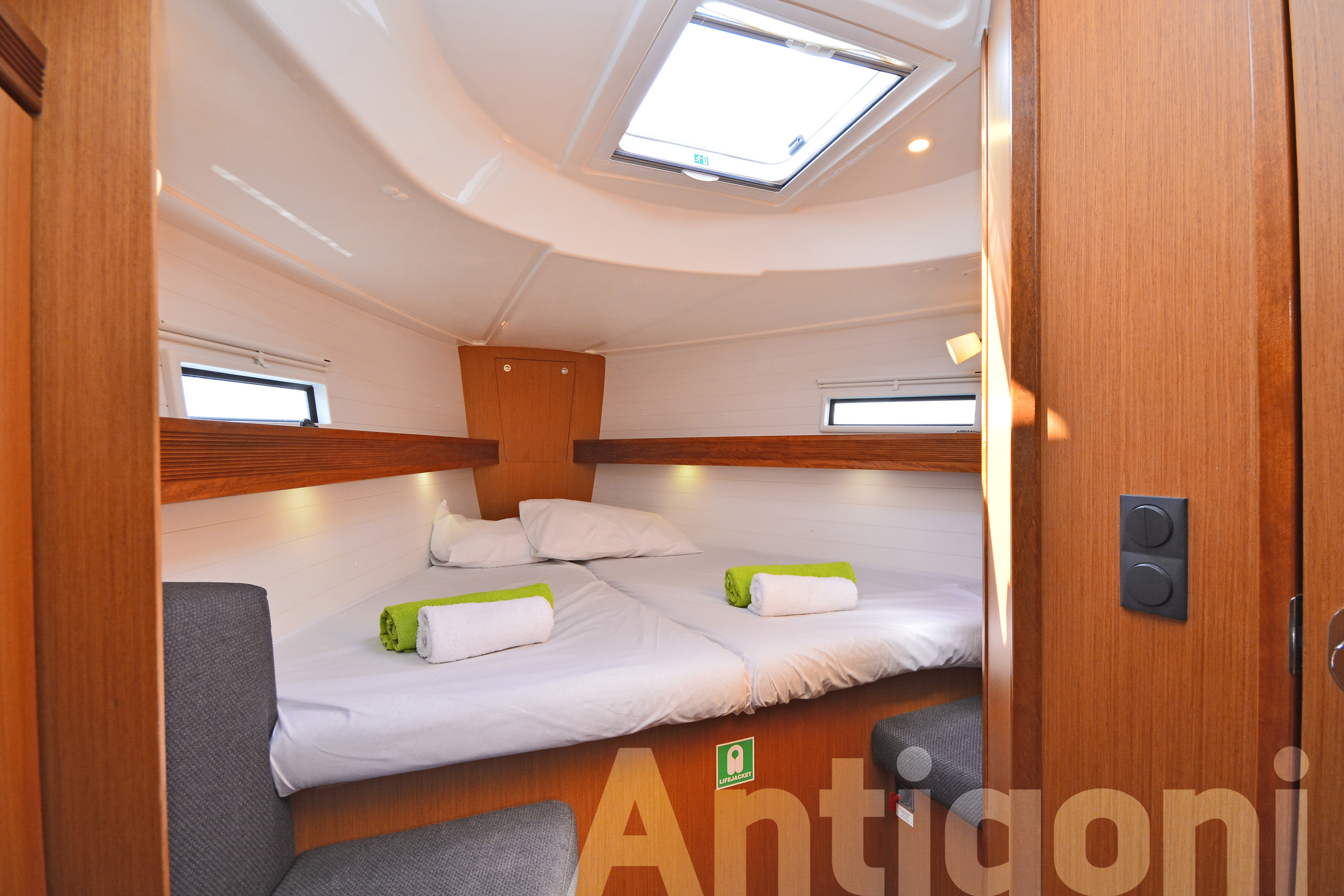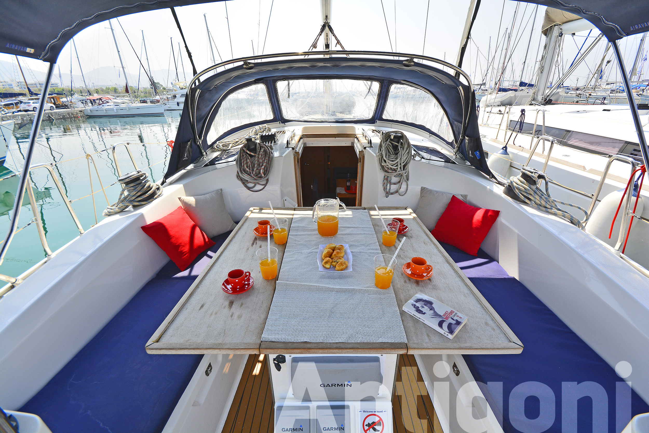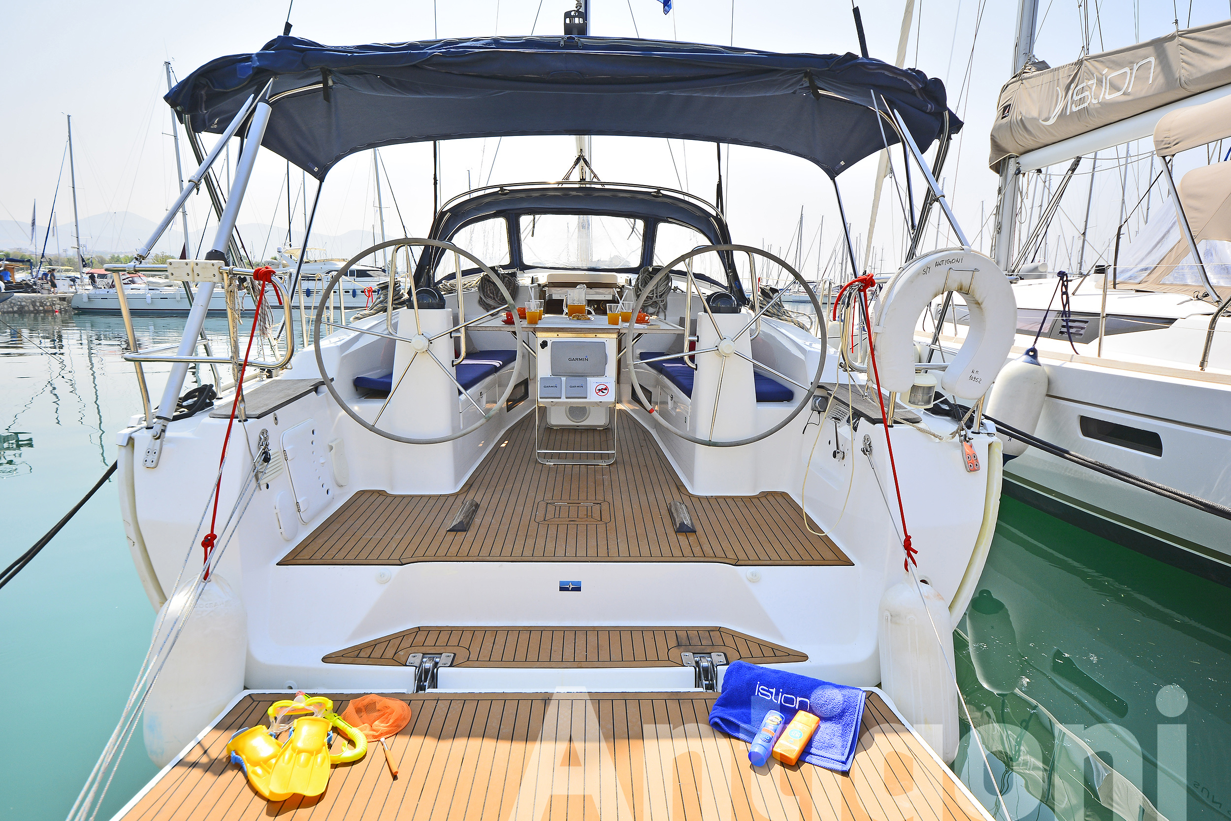 BOAT HOOK, COCKPIT CUSHIONS, COCKPIT SPEAKERS, COCKPIT TABLE, DECKBRUSH, DECK SHOWER, DIESEL JERRYCAN, DINGHY, DOOR PANELS-KEYS, ENGINE OIL, FENDERS, FUEL FUNNEL, GANGWAY, GAS BOTTLES, HAND BILGE PUMP, MAIN ANCHOR-CHAIN, MOORING LINES, OUTBOARD MOTOR, PLASTIC BUCKET, PUMP & OARS FOR DINGHY, SECOND ANCHOR, SWIMMING LADDER, SWIMMING PLATFORM, WATER HOSE, WINCH HANDLES, BIMINI TOP, FURLING GENOA, SHEETS, SPRAYHOOD, BLACK BALL, BOX OF FLARES, EMERGENCY HELM, EPIRB, FIRE EXTINGUISHERS, FIRST AID KIT, FLOATING LIGHT, FOG HORN, HORSESHOE LIFEBUOY, LIFE JACKETS, LIFE RAFT, RADAR REFLECTOR, SAFETY BELTS, TORCH LIGHT, AUTOPILOT, BAROMETER, BINOCULARS, CLOCK, COCKPIT COMPASS, DIVIDER, ECHO SOUNDER, ERASER, GPS, GREEK WATERS PILOT, HAND BEARING COMP, PARALLER RULER, PENCILS, PLOTTER, SEA CHARTS, SPEED LOG, VHF, WIND INSTRUMENTS, BOAT DOCUMENTS, BOAT MANUALS, DINGHY REPAIR KIT, SAILS REPAIR KIT, TOOLBOX, BED SHEETS, BLANKETS, PILLOWS, PILLOWS CASES, TOWELS, 220 VOLT SOCKETS, BATTERY CHARGER, HOLDING TANKS, AUX FOR IPOD/IPHONE, CD PLAYER, SNORKELING EQUIPMENT, USB CONNECTION, BREAD KNIFE, CAN OPENER, CHOPPING BOARD, CORK SCREW, CUPS, DINNER PLATES, DUSTPAN & BRUSH, ELECTRIC FRIDGE, FILTER COFFEE POT, FORKS, FRUIT PLATES, FRYING PANS, GAS STOVE, GLASSES, KETTLE, KNIVES, SALAD BOWL, SAUCE PANS, SOUP PLATES, SPOONS, TEA SPOONS, TEA STRAINER, TOILET BRUSH, ANCHOR WINDLASS & HANDLE, ELECTRIC TOILETS, GPS IN COCKPIT, SOLAR PANELS
