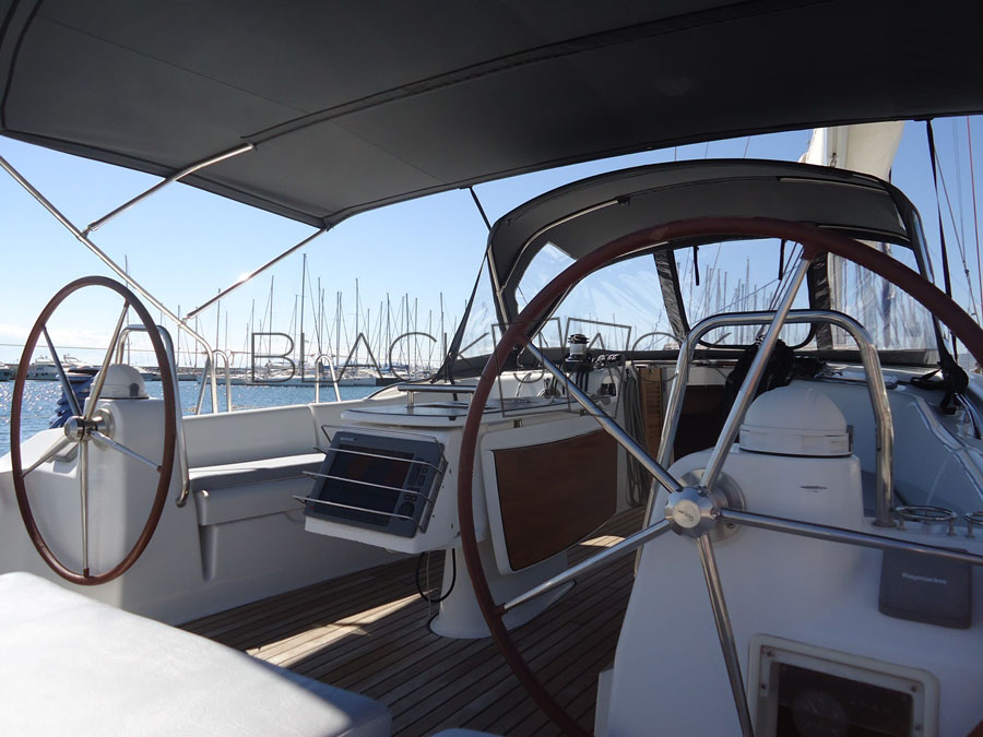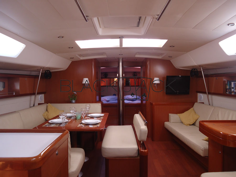 Dinghy Inflatable, Outboard engine, Shore Power Connection, Cockpit Speakers, TV + DVD, Radio/CD, Cooker with oven, Cool Box, Freezer, Microwave, Refrigerator, Sinks (num.), Autopilot, Main Deck Compass, VHF, Air Conditioning, Heating, Hot Water System, Genoa Furling, Lazy Bag, Wheel Steering, Bathing Platform, Bimini, Deck Shower, Deck Tent, Electric Windlass, Teak Decks, Anchor, Bow Thruster, Dinghy with Outboard Motor, Echo Sounder, Life jacket, Linen, Main Sail Full Batten/Lazy Jack, Nautical charts and nautical guide, Navigation kit, Pillows and blankets, Radio Cass/Radio/CD Player with Speakers in Saloon & Cockpit, Speedometer, Spray hood, Wind Speed Indicator/Network Wind, Auxiliary anchor, Calibrated anchor chain, Dan Buoy, Distress flares, Fire extinguisher, First aid kit, Lifebuoy, Liferaft, Main anchor, Safety harness, Snorkel Equipment, Engine Battery (in Ah.), Service Battery (in Ah.), Fans, Gangway, Generator (KVa), Battened main sail, Roller genoa, GPS Plotter, USB plugs