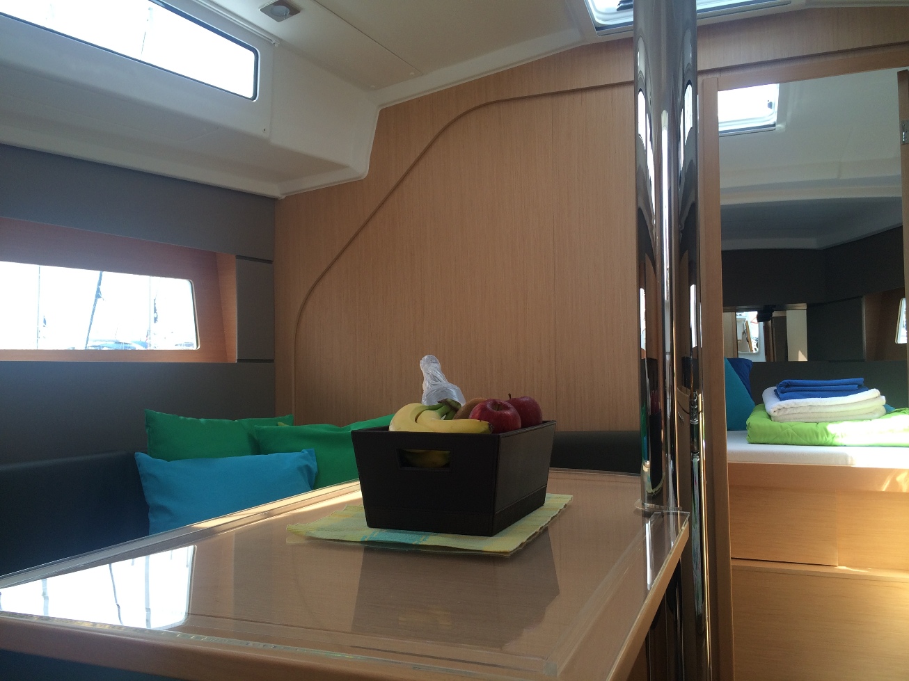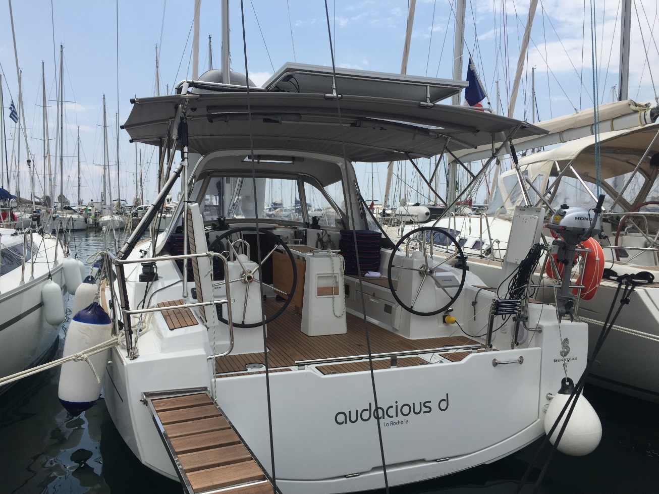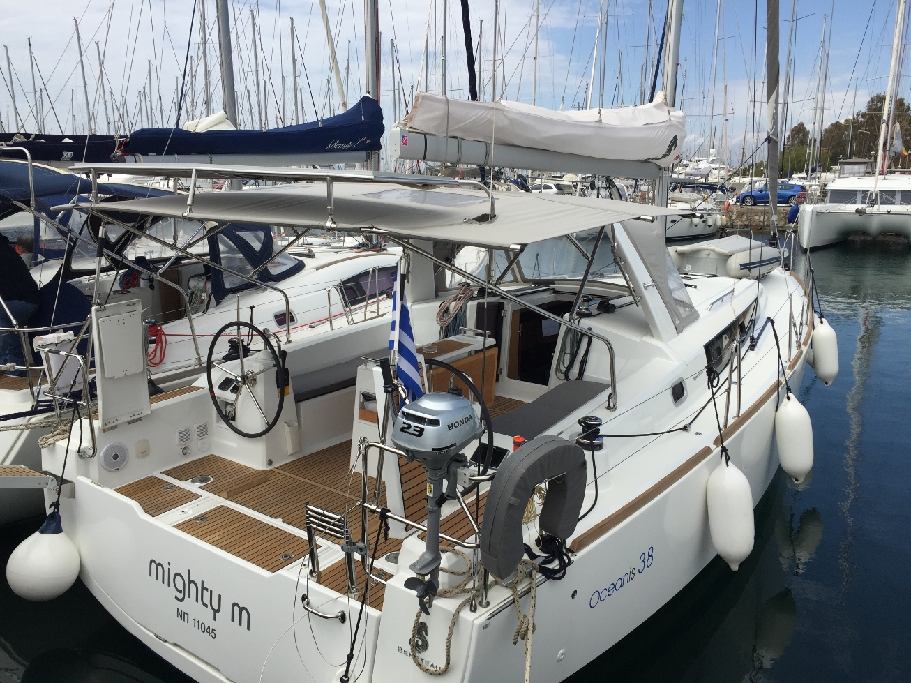 Solar Panel, Boat hook, Dinghy pump & repair kit, Dinghy with oars, Fenders, Horse shoe, Life buoys, 10m-Rope, 20m-Rope, Anchor with Chain (10m), Bucket, Dustpan & Brush, Deck Brush, Diesel Funnel with strain, Emergency Tiller, Flippers and Mask, Floating Rope (50m), Fuel Jerry Can-20L, gas Bottle (1 full-1 in use), Life Raft, Oil Funnel, Portable hand pump, Water Hose, Water Jerry Can-20L, Wire Rope Cutter, Binoculars, Bosun`s chair, Chart Divider, Colision regulation book, Greek waters pilot, Hand-bearing compass, List of lights, Medical guide, National flag, Parallel ruller, Set of charts, Torch, Winch handle, Full galley equipment, Battery operated navigation lights, Black ball, Black cone, Fire extinghusher, First Aid Kit, Flags C and N - 1 set, Fog Horn, Hand flares/Parachute rockets/Smoke signals-set, Life jackets, Radar reflector, Safety harnesses, Signal mirror, Boat manual, Boat official documents, Engine manual, Alternator belt, Engine oil, Fuel filter, Oil filter, Seawater impeller, Spare bulbs, fuses & batteries, Spare filter, Tool box, WD-40 anti rust spray, Bed sheets, Blankets, Pillow cases, Pillows, Towels, Blister, Outboard motor Yamaha 2.5HP, Autopilot, Bimini Top, Classic main sail, Echo sonuder+Log+Wind indicator, Electric windlass, Furling genoa, Gas stove/oven, GPS Plotter, Refrigerator, Sprayhood, VHF, Battery charger+Shore power, Cockpit speakers, EPIRB, Iphone connection, Radio+Sound System+ipod input