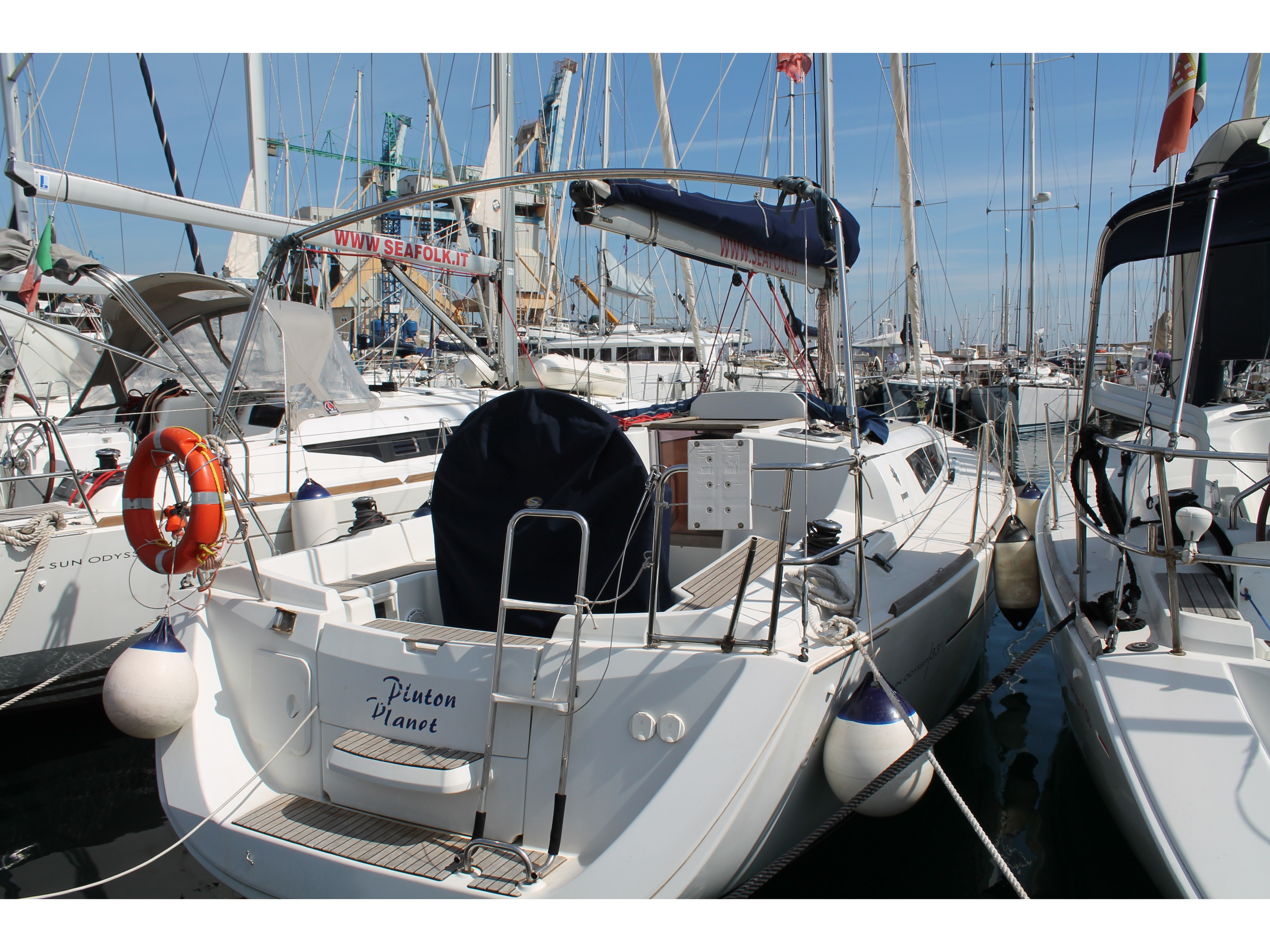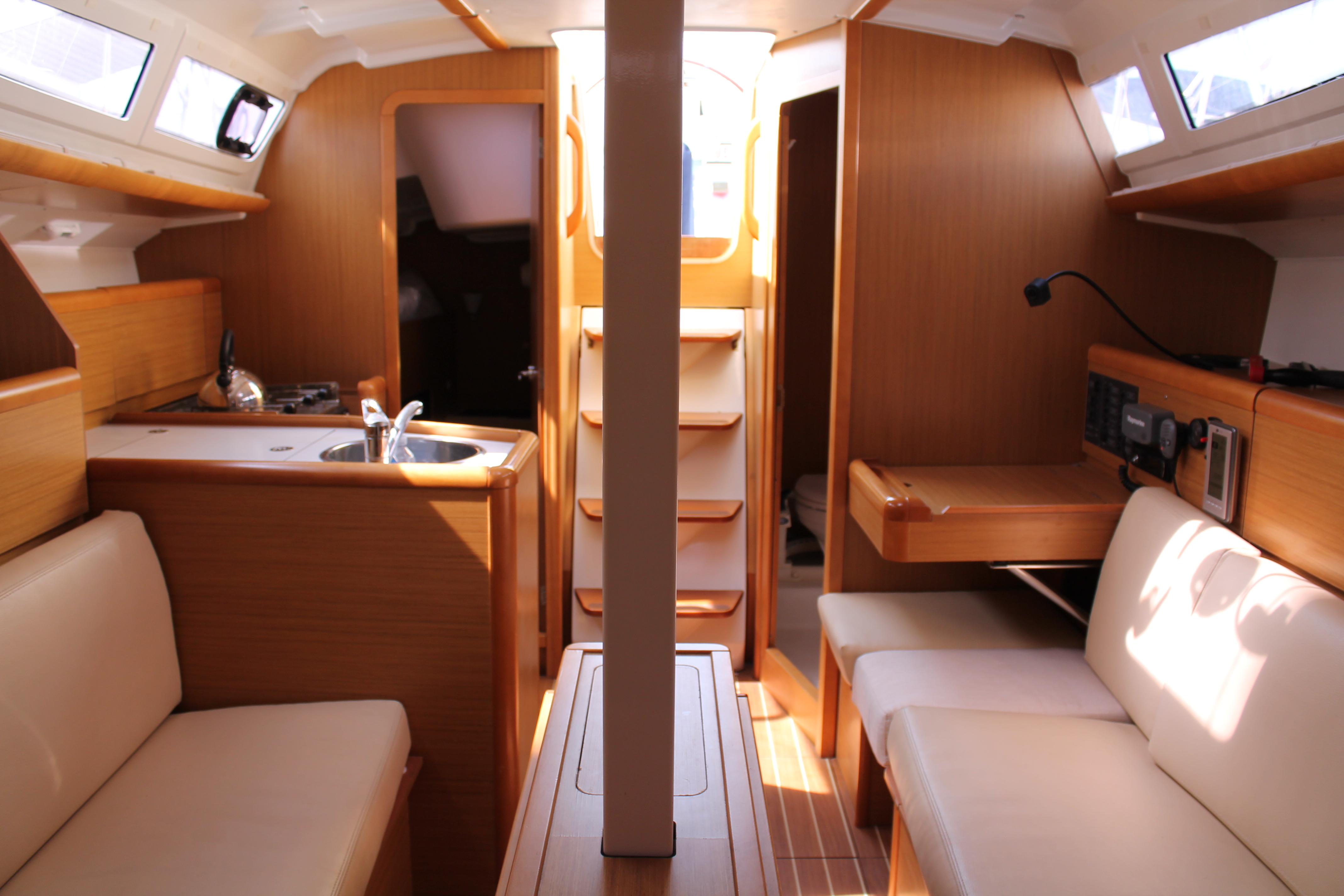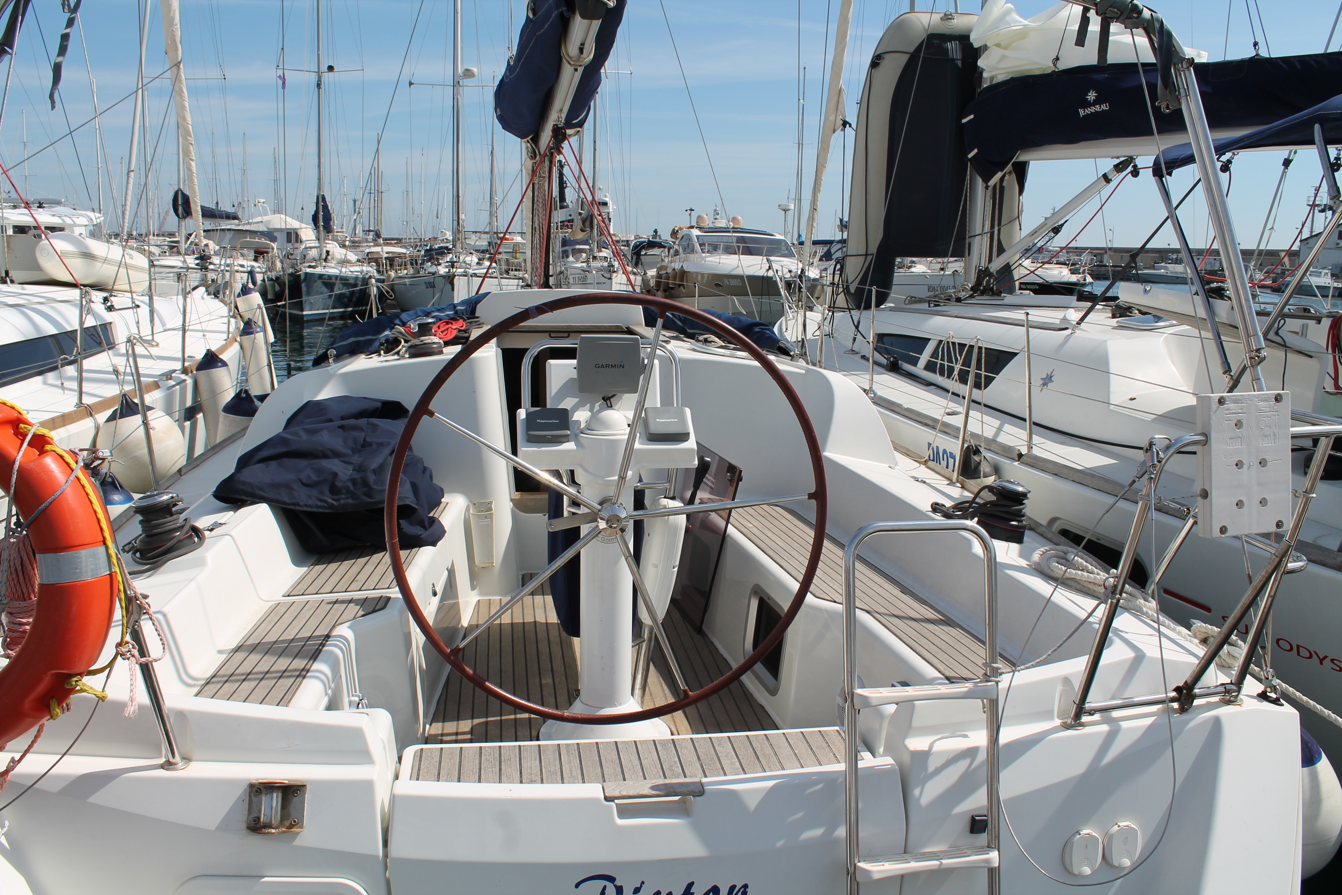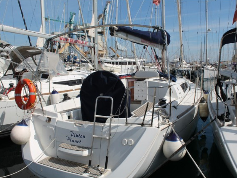 Anemometer, Autopilot, Battery charger, Bimini Top, Cartographic GPS, Cockpit cushions, Cockpit speakers, Cockpit table, Deck light, Deck shower, Dinghy, Echo Sounder, Electricity on board 12V and 220V, Electric windlass, Furling Genoa, GPS + plotter, Inverter, Lazy Bag, Log/Speedo, Radio CD Player, Shore power cable 220V, Sprayhood, Waste tank, Semi-full batten mainsail