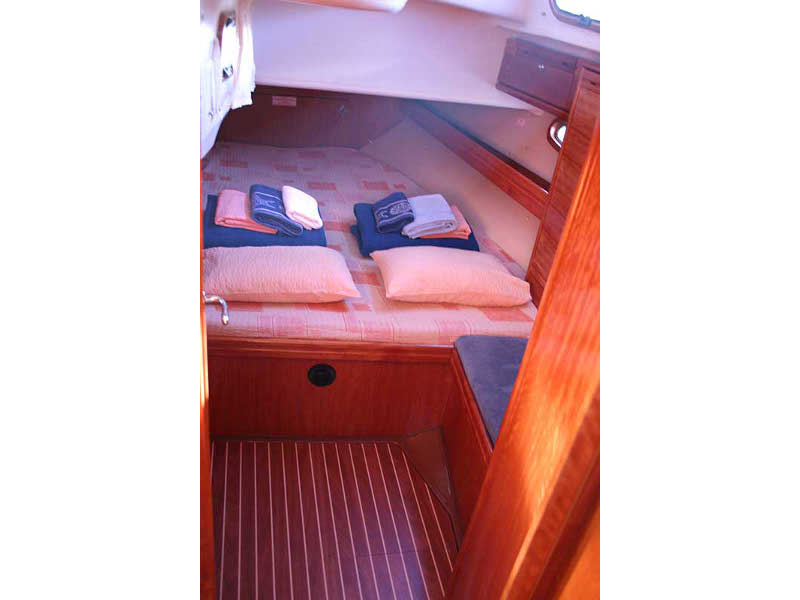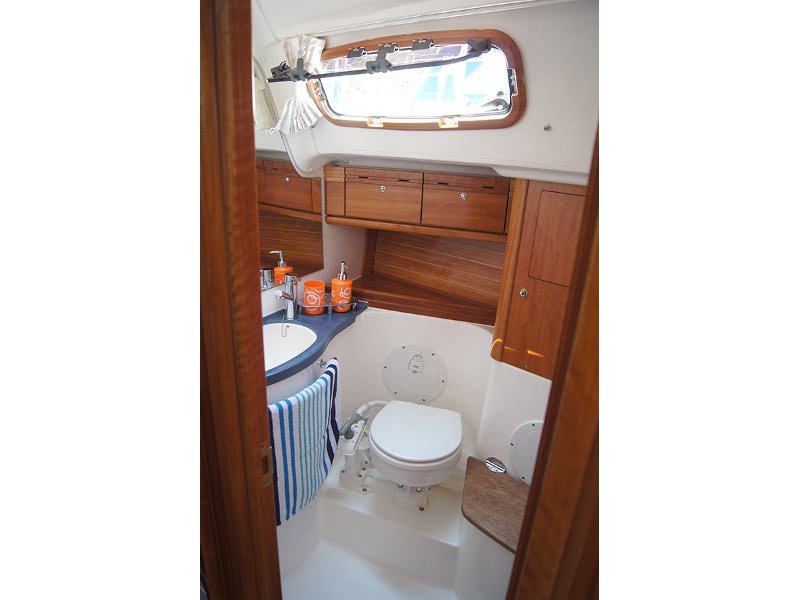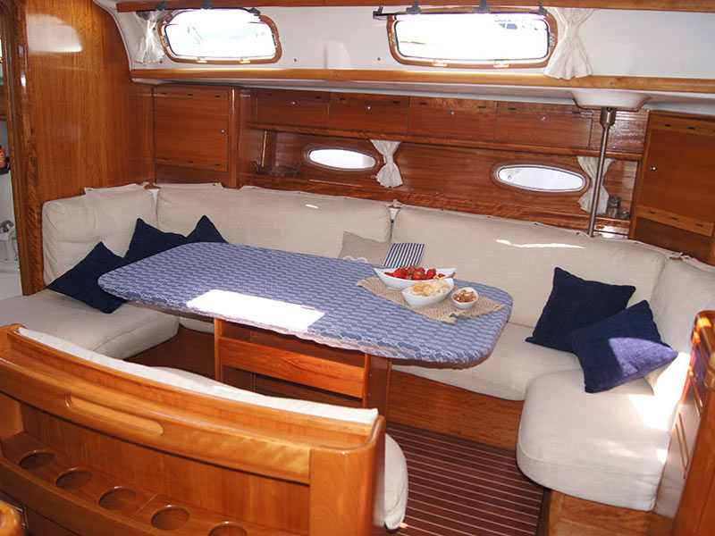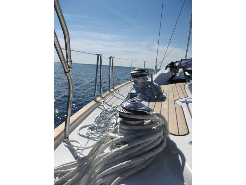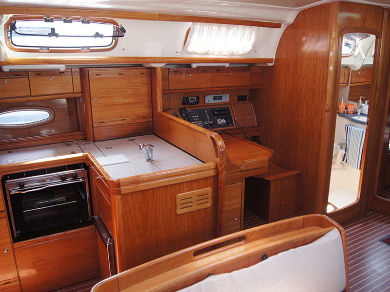 12 volt socket, 220 volt socket, Autopilot, Barometer, Bimini, Binoculars, Bosuns chair, Box of flares, Clock, Cockpit control panel, Cockpit speakers, Cockpit table, Deck shower, Dinghy, Diving mask, DVD, Echo-sounder, Electric bilge pump, Electric fridge, Electric toilet, Electric windlass, Electronic sea charts, Emergency tiller, EPIRB, First aid kit, Flags QNC, Flippers, Floating light, Gas bottle, Gas stove with oven, GMDSS, GPS, Hand bearing compass, Holding Tank, Horse shoe bouy, Hot water, Inflatable life raft, Life jackets, List of lights, Log, Main compass, MCA coded, Navigation lights, Pilot book, Plotter, Radio-CD player, Safety harnesses,, Sail repair kit, Sea Anchor, Sea charts, Ships licence, Solar panels, Spray-hood, Swimming ladder, Tools, Torch, TV, V.H.F, Windex, Wind speed, Bow thruster, Kayak