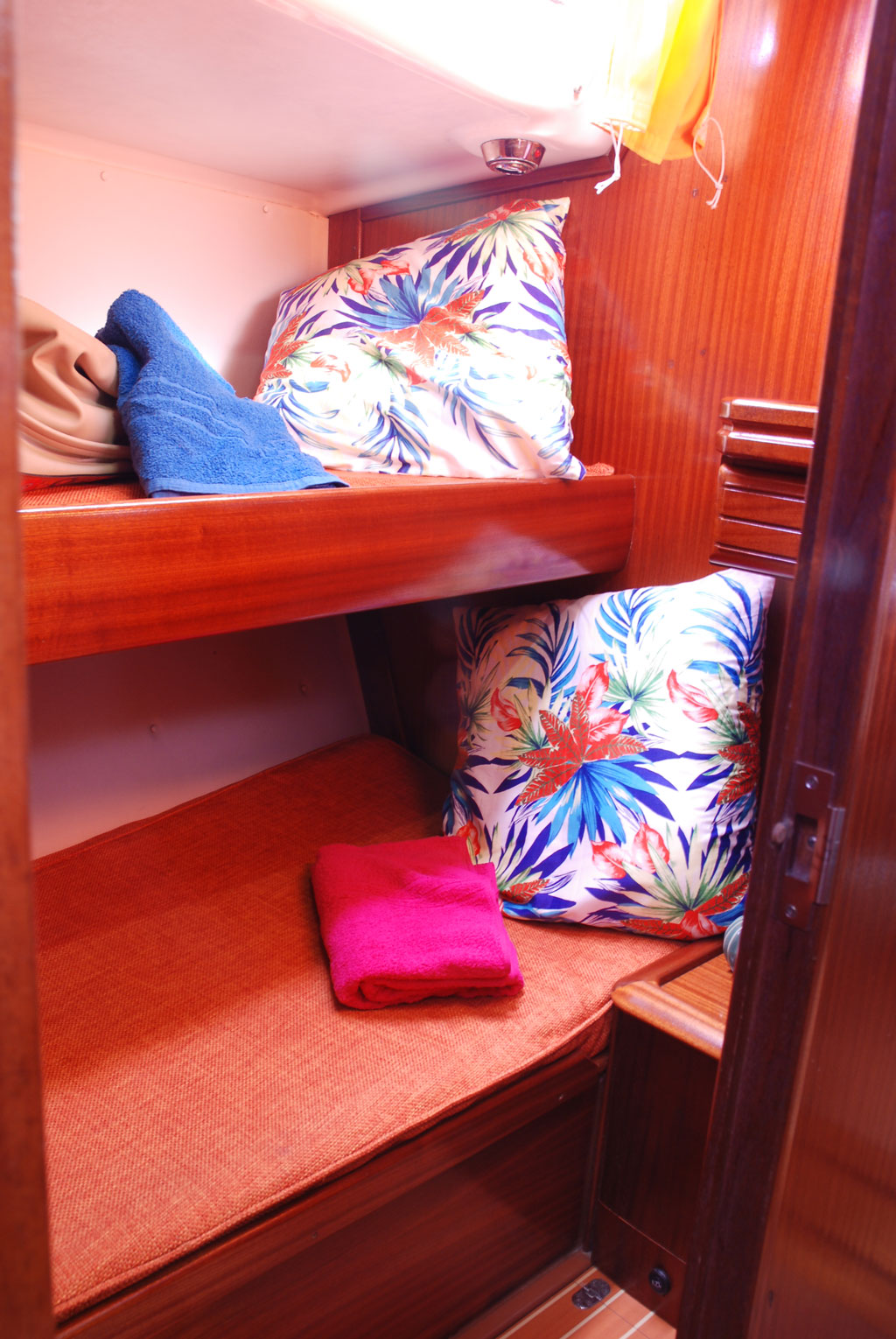 Bow thruster, Full Batten Mail Sail, Idraulic Gangway, Loudspeaker in cockpit, Inverter, Autopilot, Bimini, Cockpit cushions, Electric fridge, Electric Winch, Electric windlass, Furling genoa, GPS Chart plotter, Hi-Fi, Hot water, Lazy bag, Sprayhood, Teak deck, Tender, Tridata, Wind instruments, Lazy Jack