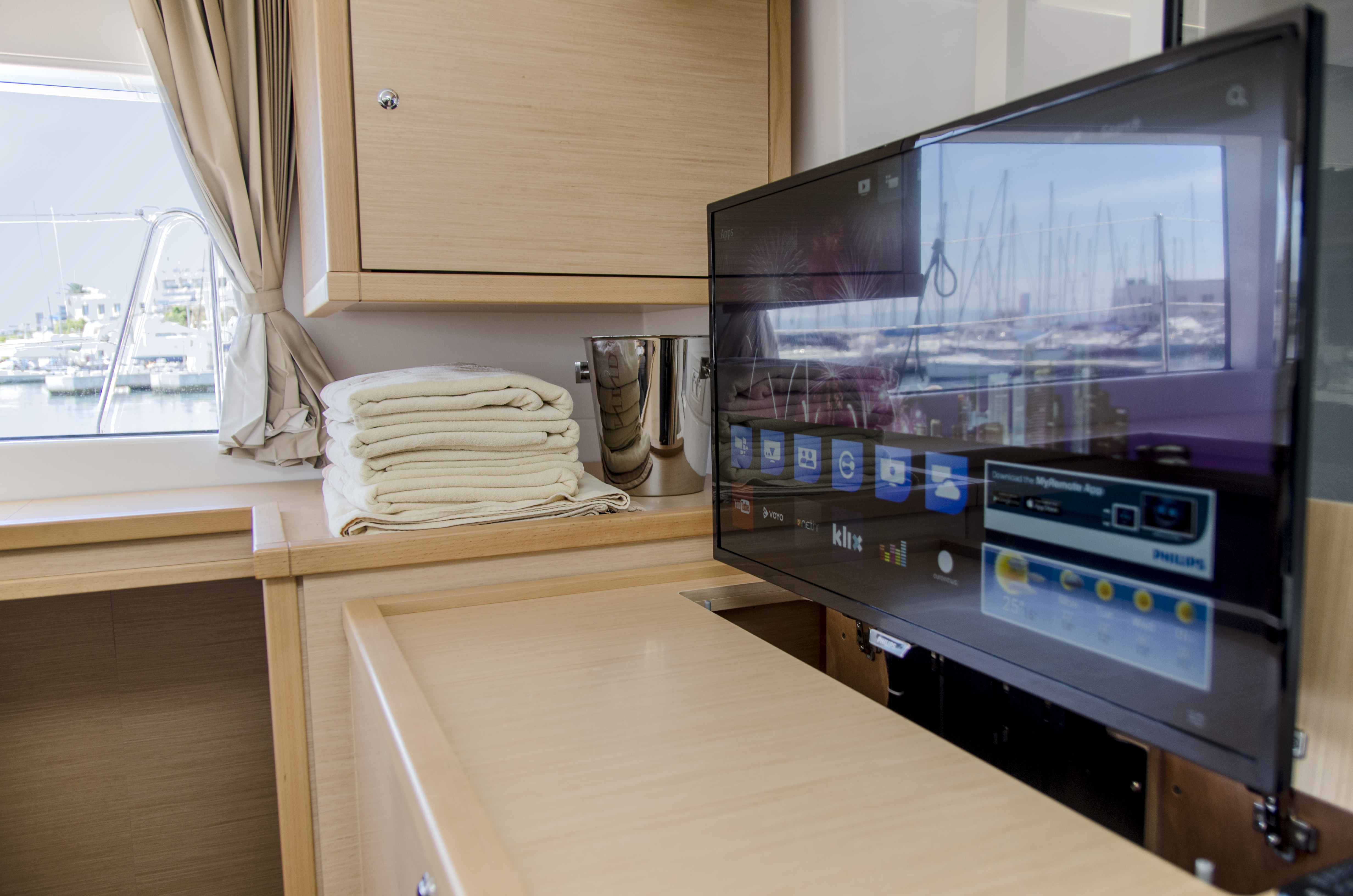Dinghy Rigid, 220 V shore connection, battery charger, electrical toilet, Engine Battery (in Ah.), Generator, Service Battery (in Ah.), Cockpit Speakers, Radio/CD, TV + DVD, additional refrigerator in saloon, Cooker with oven, Cutlery, dishes, dishwashing machine, gas stove, icemaker, Microwave, refrigerator 130L, water heater, Autopilot, Chartplotter, Depth Gauge, depth sounder, GPS Chartplotter, Main Deck Compass, Radar, Air Conditioning, fans in cabins, Heating, Bimini, Cockpit Fridge, cockpit shower, Cushions in cockpit, Electric Windlass, XL Bimini top , Full batten Main Sail, Rollgenua, Bow Thruster, hand towels, Linen, Auxiliary anchor, Calibrated anchor chain, Dan Buoy, Distress flares, Fire extinguisher, First aid kit, Lifebuoy, Life jackets, Liferaft, Safety harness, Watermaker