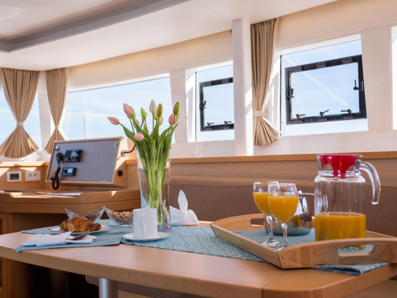 Full batten main sail, Furling genoa, Carbon gangway, Large bimini on flybridge, Teak cockpit, Air Condition, Bed linen & towels, El. refrigerator, Galley equipment, Generator, Hot water, Ice maker, Music system, Smart TV, Autopilot , Chart, GPS, Life raft, Multi instruments , Plotter VHF, Radio, Dinghy, Donut, Kayak, Kneeboard, Snorkelling set, Stand up paddle board, Outboard engine