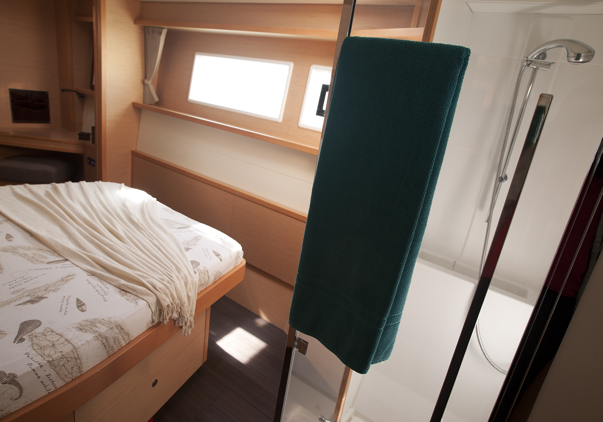 Dinghy Rigid, Outboard engine, 220 V shore connection, electrical toilet, Engine Battery (in Ah.), Generator, Service Battery (in Ah.), Shore Power Connection, Cockpit Speakers, Radio/CD, TV + DVD, Cutlery, dishes, icemaker, Refrigerator, Sinks, Autopilot, GPS Chartplotter, Log/Speedo, Main Deck Compass, Air Conditioning, Hot Water System, Standard main sail, Rollgenua, Bathing Platform, Cockpit Fridge, Electric Windlass, Gangway, Bow Thruster, hand towels, Linen, underwater lighting, Auxiliary anchor, Calibrated anchor chain, Distress flares, Fire extinguisher, First aid kit, Lifebuoy, Liferaft, Main anchor, Safety harness, 2 person Kayak, S.U.P., Snorkel Equipment, water ski, beach towels, Life jackets, water heater, Watermaker, Bimini, sprayhood, teak cockpit, VHF, Heating, Freezer, gas stove, battery charger, Nautical charts and nautical guide, Pillows and blankets